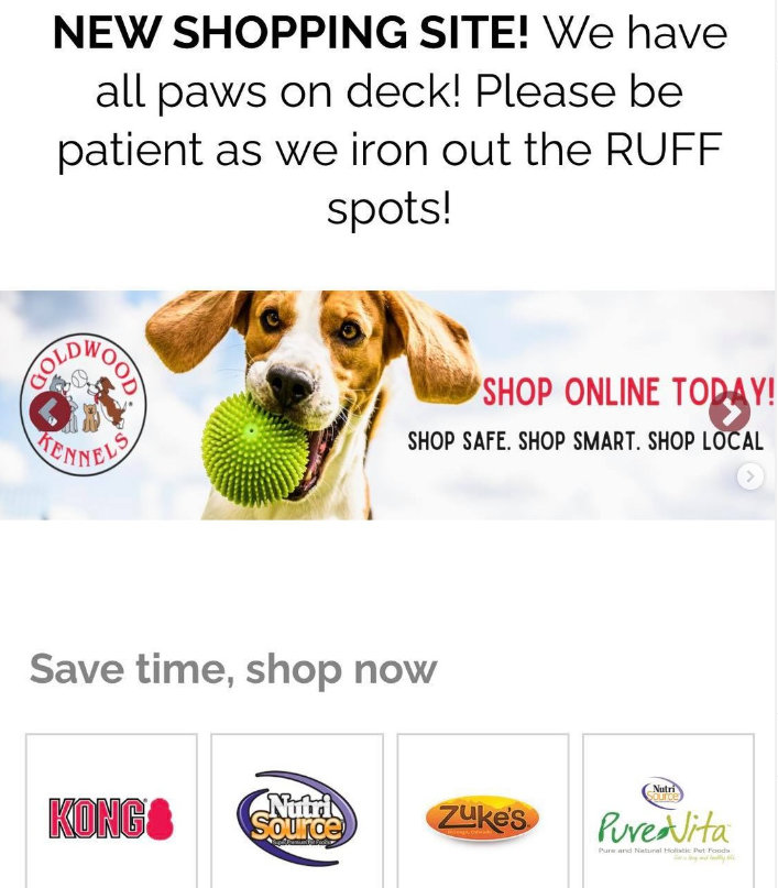 Our Pet Boutique is now online! Now you can shop for all your favorite toys, treats and pet food online with options for curbside pick up or local delivery. Visit today and place an order at shop.goldwoodkennels.com/products/shop/